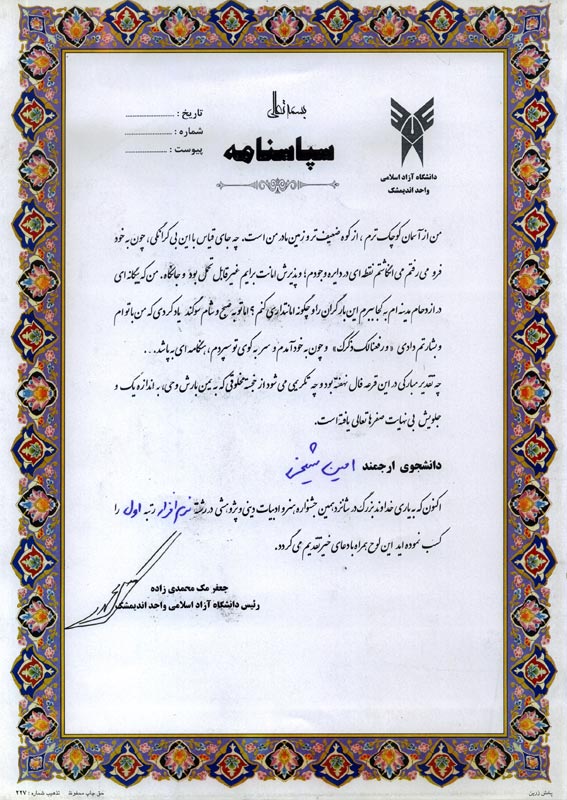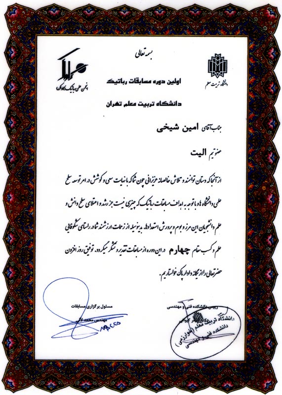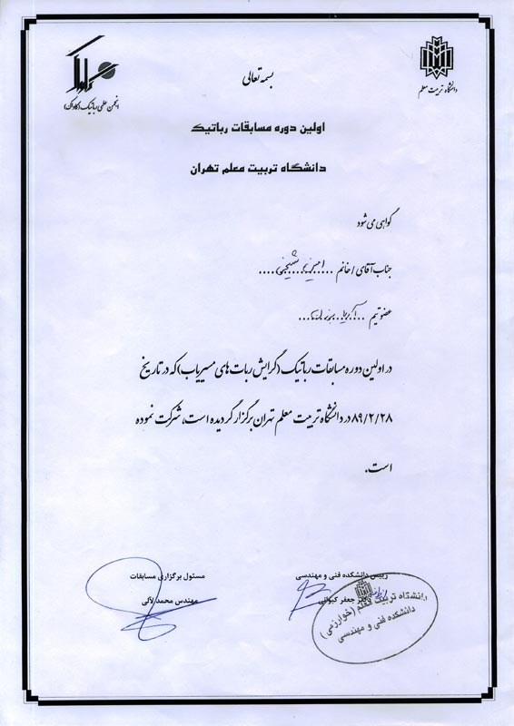 | کسب مقام چهارم در مسابقات روباتیک، دانشگاه تربیت معلم تهران سال 1389 |